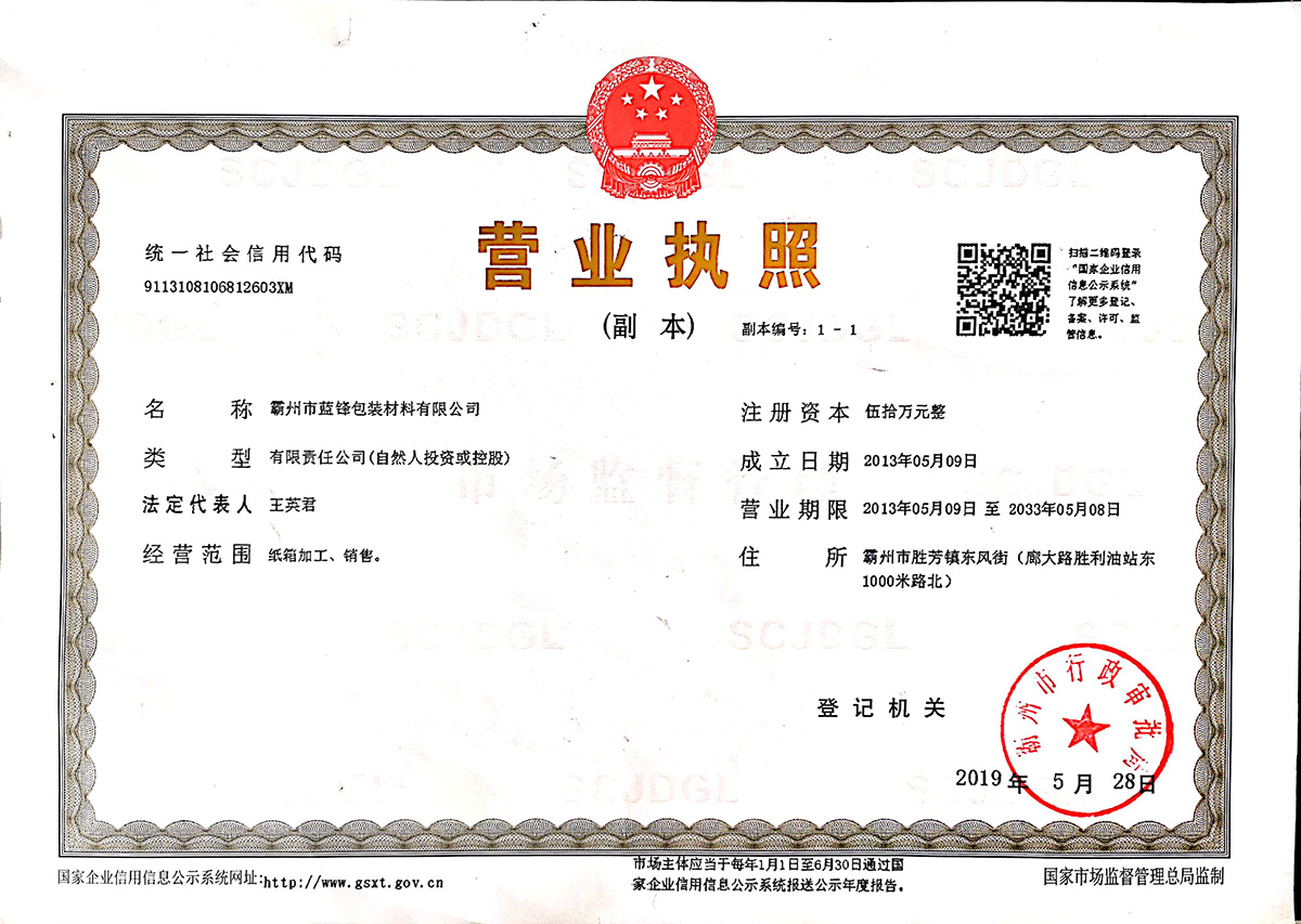 立即咨詢(xún)霸州市藍(lán)鋒包裝材料有限公司,前身為成立于1988年的勝芳鎮(zhèn)藍(lán)劍紙箱廠(chǎng)。是河北省較早涉足紙包裝制品的民營(yíng)企業(yè)。經(jīng)過(guò)近三十年的發(fā)展,公司已經(jīng)由起初的家庭作坊發(fā)展為現(xiàn)有標(biāo)準(zhǔn)化廠(chǎng)房8000平米,員工50人,其中管理人員7名;年產(chǎn)紙箱上億平米的現(xiàn)代化企業(yè)。
